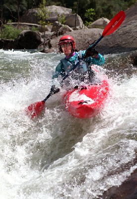 Chris Shackleton running the last drop on the Tiger Creek Dam run of the North Mokelumne. This run has become a classic: short, relatively easy Class IV, but sweet. - Photo: Craig Sanders | ![]() |