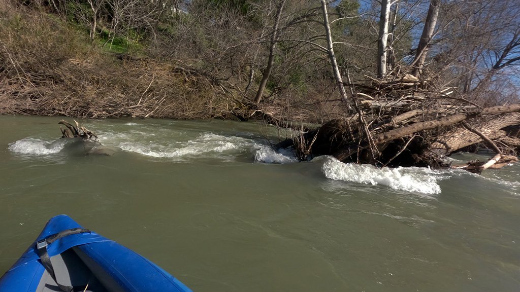 | When cfs is above 1500 there is a channel flowing around to the right of this obstacle. At lower cfs, this tree is a real hazard for boats & tubers.